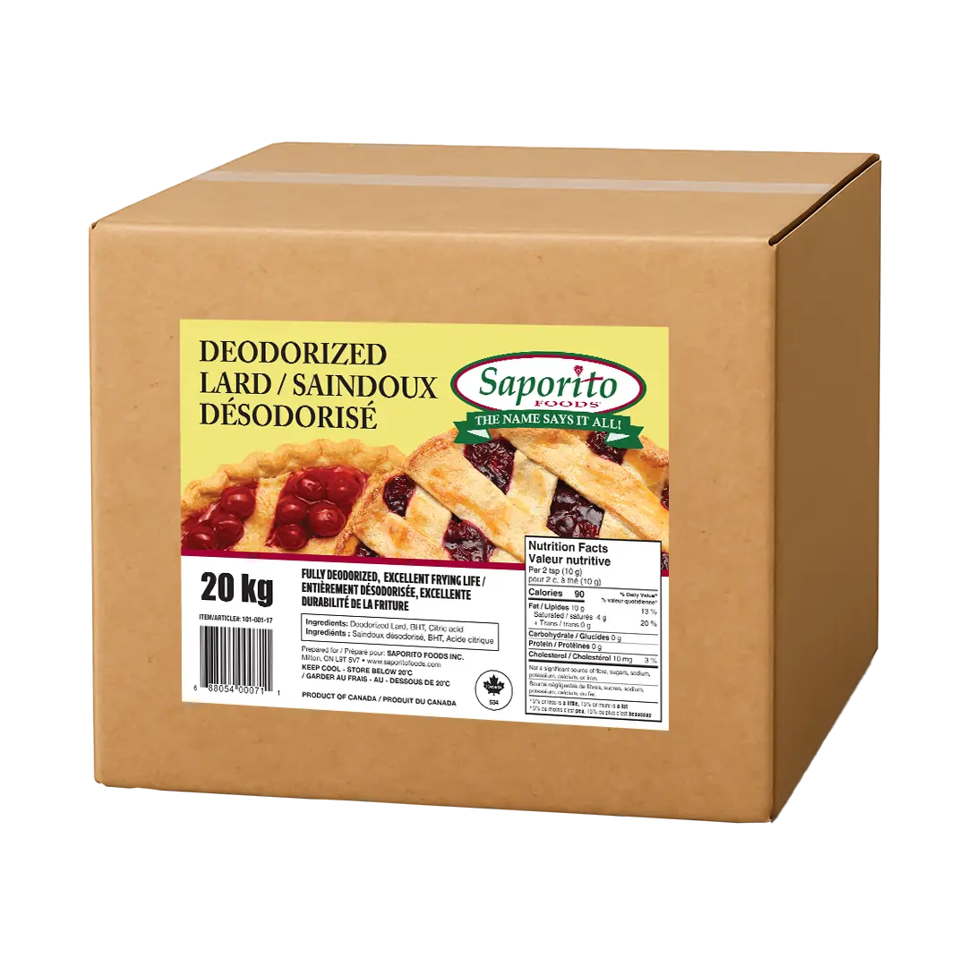 This is a fully deodorized shortening that delivers an excellent frying life and performs superbly at high temperatures. Because of its unique flaking quality, Saporito Foods deodorized Lard is absolutely superb for baking and pastry applications. Cakes, cookies, biscuits, pie crusts and pastries will be given a rich and uniform texture that is consistent and delicious.
