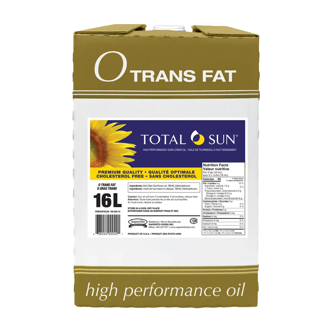 TEST CONDUCTED UNDER CONTROLLED FRYING CONDITIONS: TOTAL SUN® had a lower FFA when compared to Corn Oil & similar to CANOLA PLUS ® (FREE FATTY ACID test measures how much the oil deteriorates in the fryer). TOTAL SUN® had a lower percentage of TPC when compared with Corn Oil, and a comparable percentage to CANOLA PLUS®. (TOTAL POLAR COMPOUND test (TPC) is considered to be one of the best measures of overall frying oil degradation). Potatoes fried in TOTAL SUN® have lower levels of darkening compared to those fried in Corn Oil, and comparable to those fried in CANOLA PLUS®. (HUNTER COLOUR TEST measures the darkening of oil colour that occurs from deep-frying foods).
