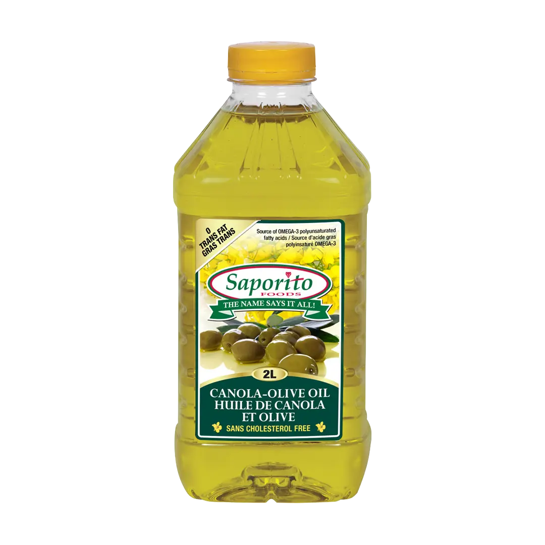 Saporito Foods Canola-Olive Oil is a PREMIUM QUALITY blended oil that is ideal for baking, seasonings, and salad dressings. Canola-Olive Oil has NO TRANS FATS, NO CHOLESTEROL, and is LOW in SATURATED FATS. A healthy diet low in saturated and trans fats may reduce the risk of heart disease. Canola-Olive Oil is also a source of OMEGA-3 polyunsaturated fatty acids.